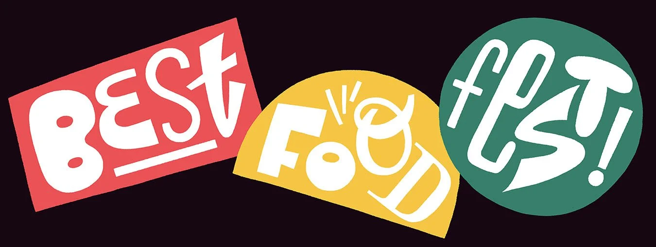 Best Food Fest branding illustration project, featuring hand-drawn lettering for a custom festival logo illustration, and festival character illustration, for a versatile festival branding suite.