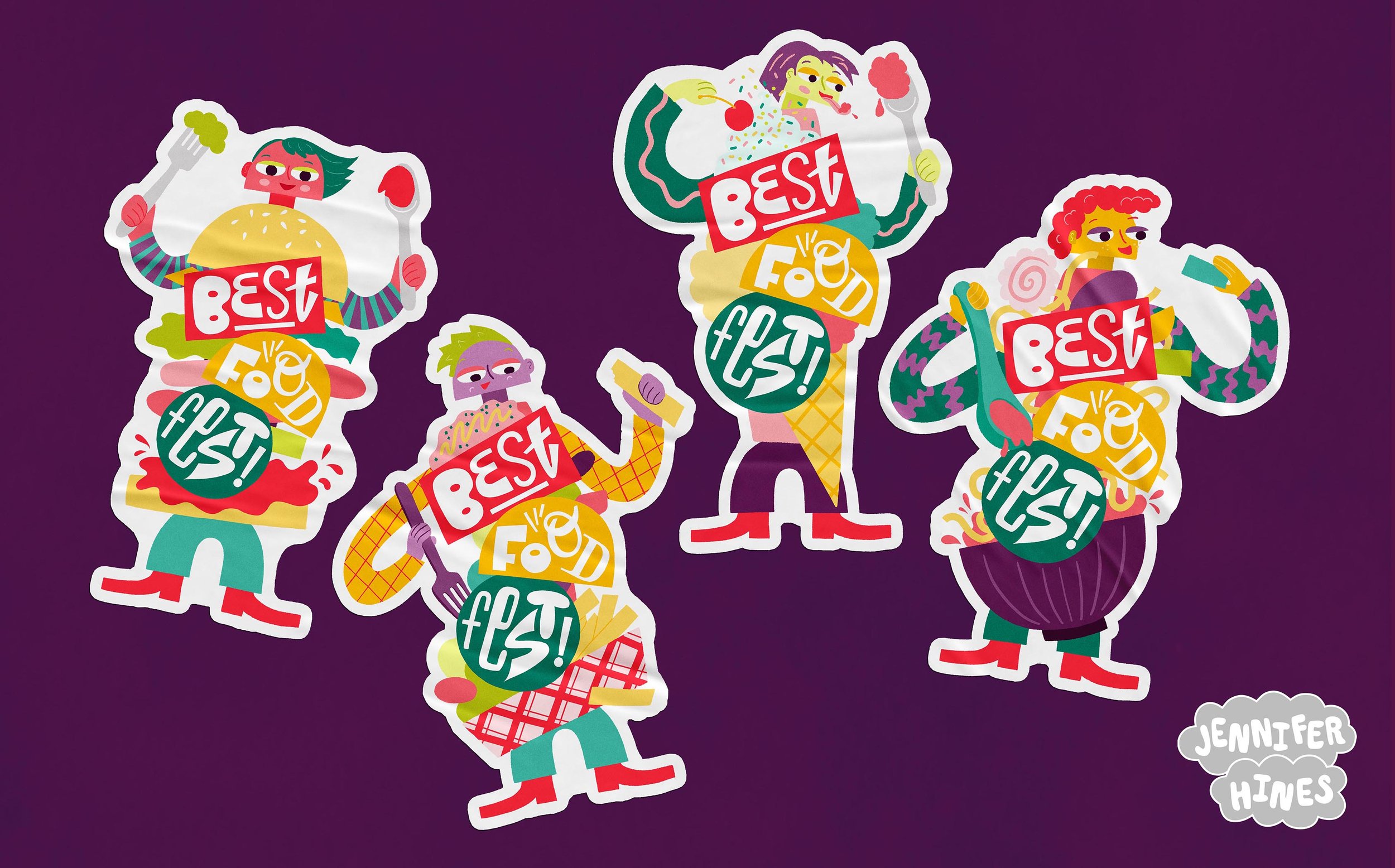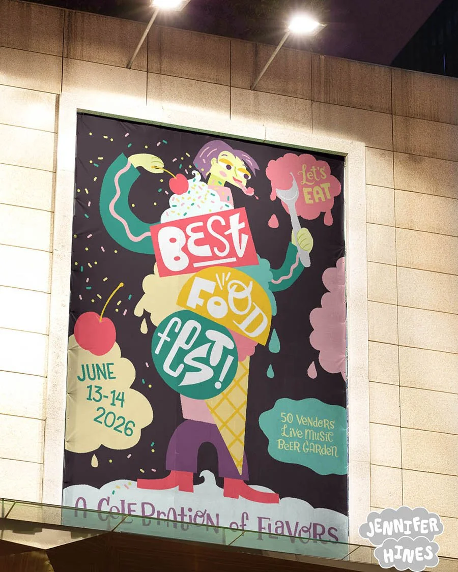For “Best Food Fest”, I created a flexible logo and playful, eye-catching poster series to highlight the fun vibes and tasty cuisines to the festival audience. The logo utilized different shapes and lettering styles to speak to the diversity of foods and is flexible to be reshaped and used across multiple touchpoints. A stacked version of the logo became the central portion of four different foods. These were used as stand-alone parts in branded materials, while also becoming the bodies of unique characters. The result is a vibrant series of colorful and flexible on-brand components including a wordmark, stacked food logos, and characters, that are sure to delight festival-goers!