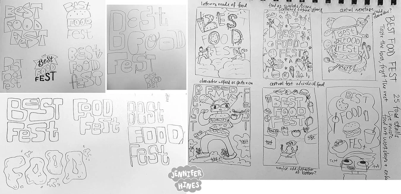 Initial sketches and thumbnails for the logo lettering exploration for the food festival branding, featuring lots of different lettering styles to speak to the varied cuisines of the food festival vendors. Also a few poster design thumbnails to test out layouts and lettering styles for the final poster series.