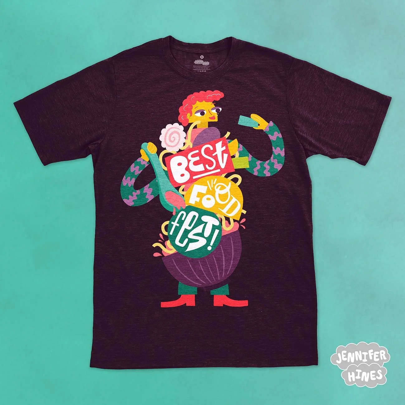 Look how amazing this t-shirt looks with the food festival character, featuring the hand-lettered food festival logo treatment as a ramen bowl character!