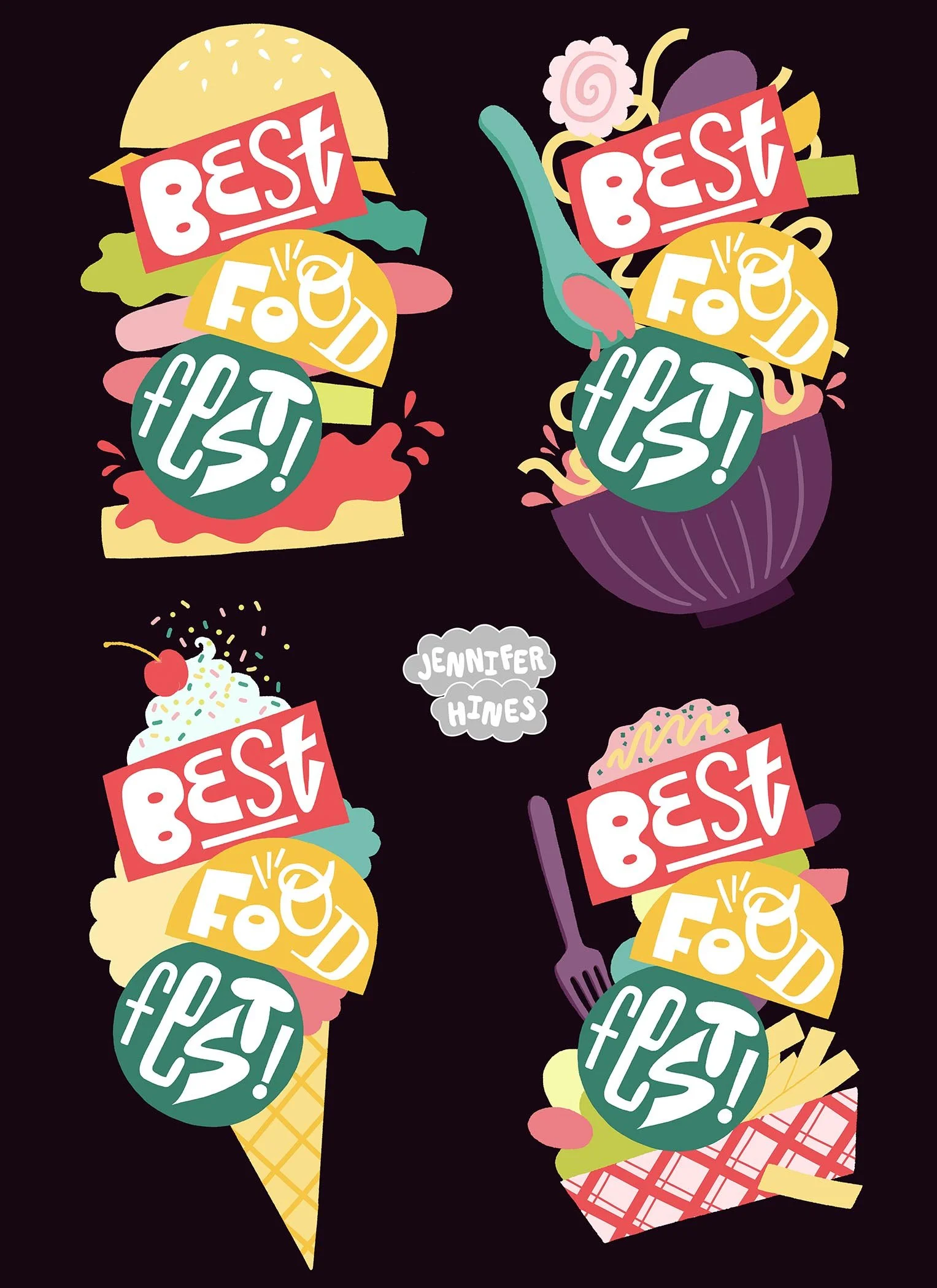 Four final food festival logo illustrations in fun stacked food layouts, showing how flexible the various components can be to bring variety and vibrancy to the food festival branding suite.
