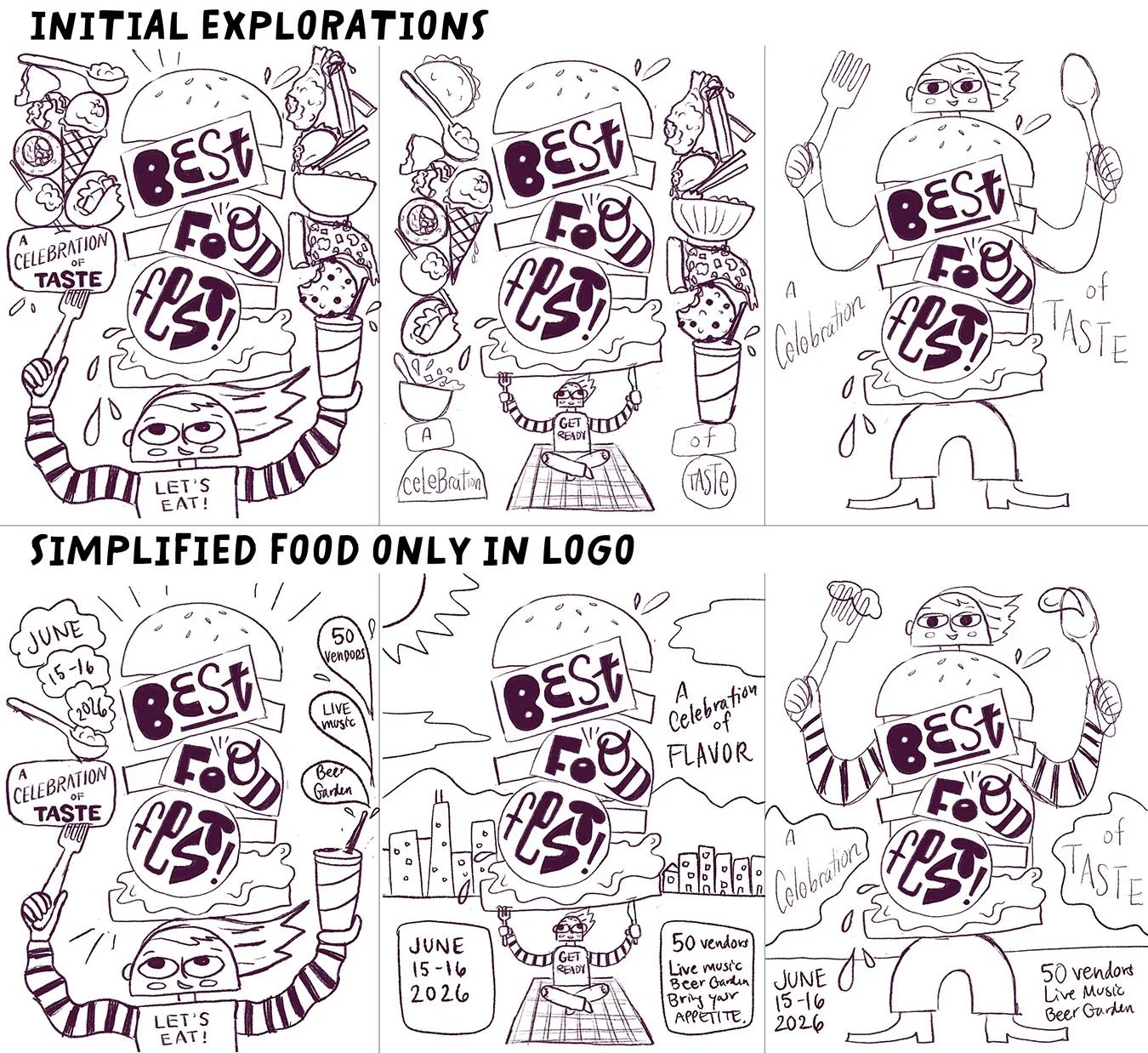 The initial 3 sketches had a lot of foods illustrated and stacked on top of the character, but in the end the simplified sketches with the food only as the stacked logo composition was more fitting and less chaotic, so I pared the complexity down to highlight the fun character and logo instead.